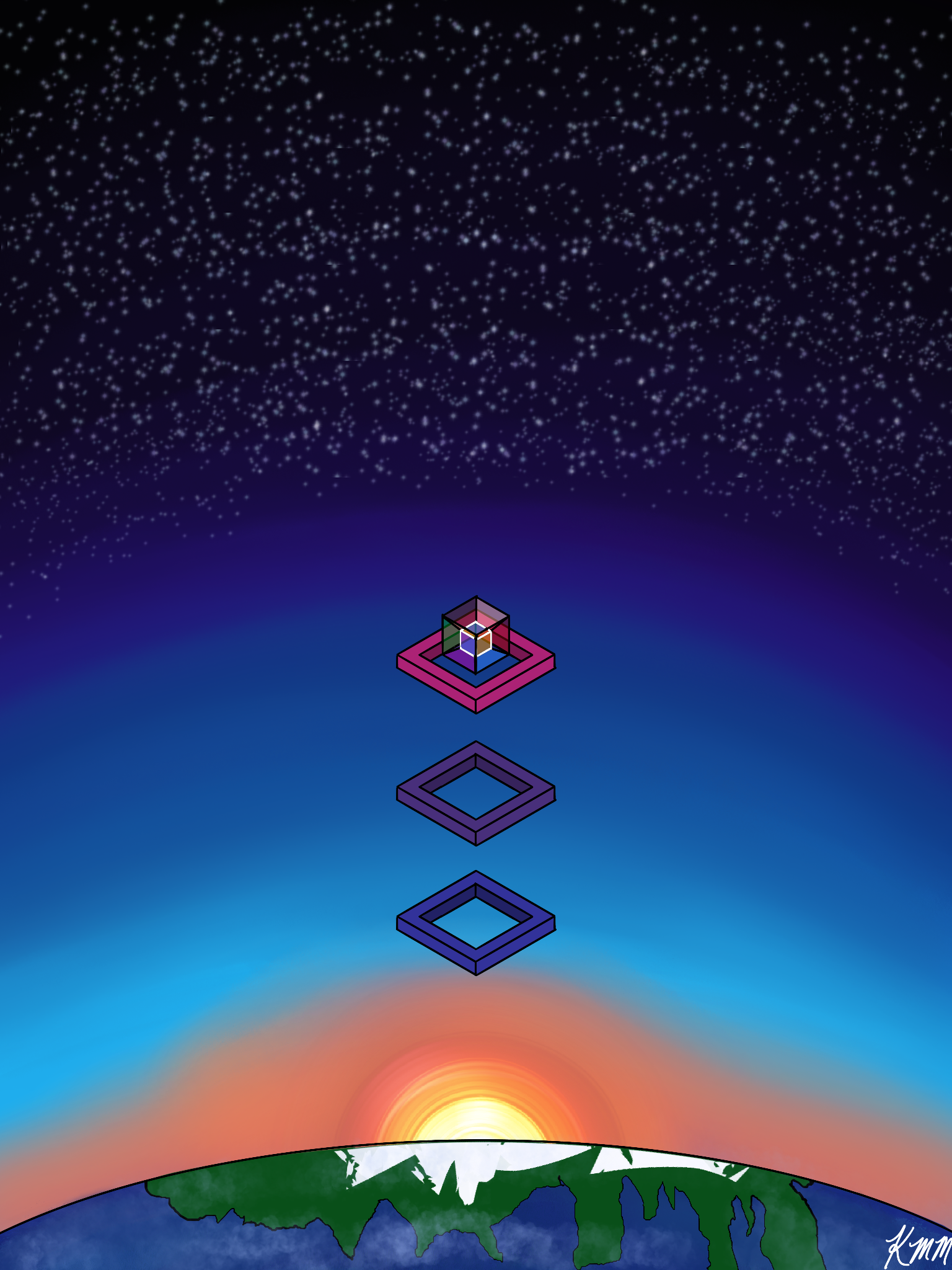 Blue + Magenta = a shade of Purple. Also, purple for me represents the balance of the emotional mind and the rational mind, to ask the wise mind. The Tesseract rising through the columns from Earth is similar to how it feels for my being experiencing the 4th dimension/Time as I rise through my stages and enter the abyss with a chain of trust.